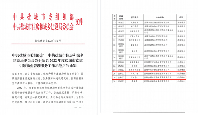 日前,鹽城市委組織部、市住房和城鄉建設局黨委聯合公布2022年度市級黨建引領物業管理服務工作示范點優秀項目名單,鹽高新集團詠恒資產管理公司管理的科技廣場、創新中心兩個物業項目榜上有名,獲評“2022年度黨建引領物業管理服務工作示范點”稱號。