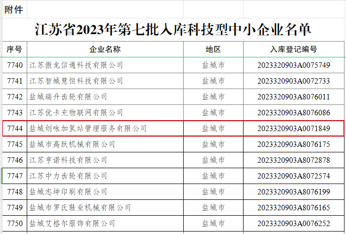 江蘇省科學技術廳日前公布了2023年第七批入庫科技型中小企業名單,鹽高新集團子企業鹽城創詠加氫站管理服務有限公司榜上有名。
