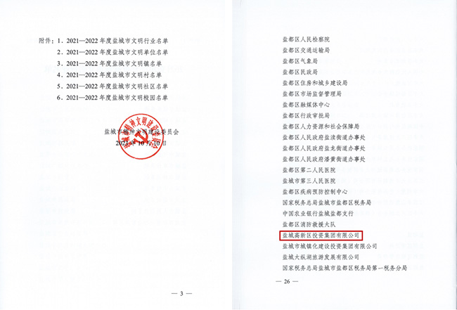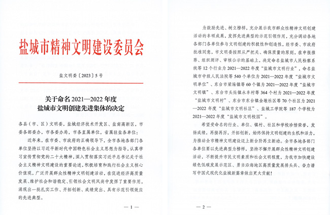 日前,市文明委印發(fā)《關(guān)于命名2021-2022年度鹽城市文明創(chuàng)建先進(jìn)集體的決定》,對(duì)創(chuàng)建全國文明城市工作中成績突出的先進(jìn)集體予以表彰,鹽高新集團(tuán)喜獲“鹽城市文明單位”榮譽(yù)稱號(hào)。