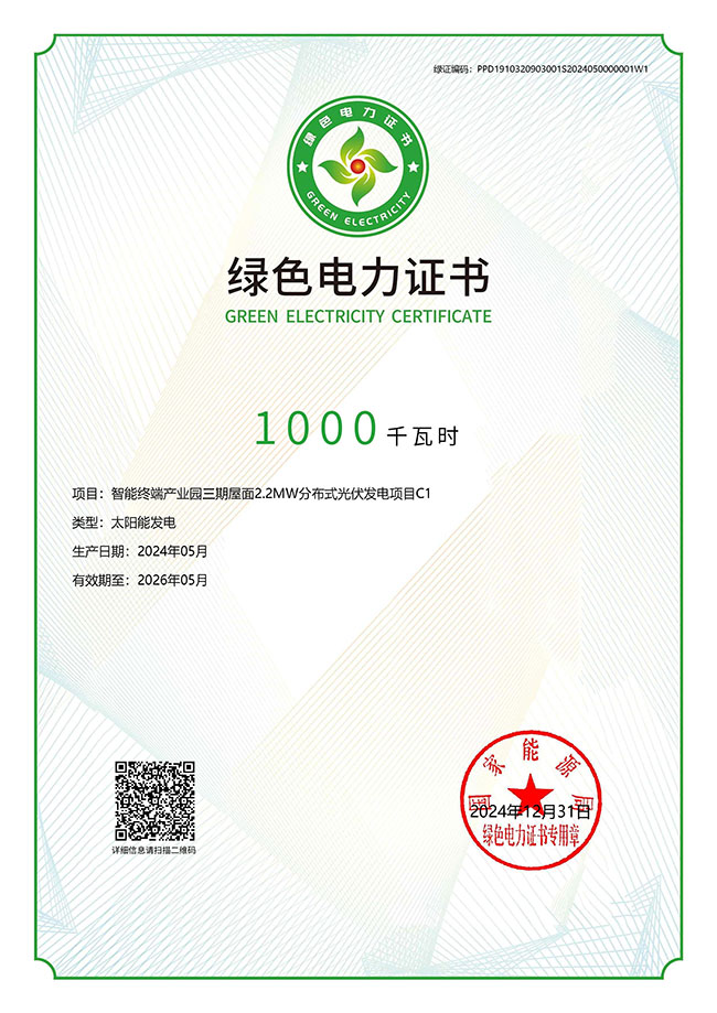 綠色電力證書是國家能源局向符合資格的可再生能源發電企業頒發的具有唯一代碼標識的電子憑證,是認定可再生能源電力生產、消費的唯一憑證。創詠新能源本批次申領綠證共計303個,一個綠證對應1000千瓦時可再生能源電力。獲得綠色電力證書的企業不僅可享受國家相關政策支持和稅收優惠,還可通過綠證交易拓寬收益渠道,有助于提高企業市場競爭力,同時促進可再生能源的快速發展。