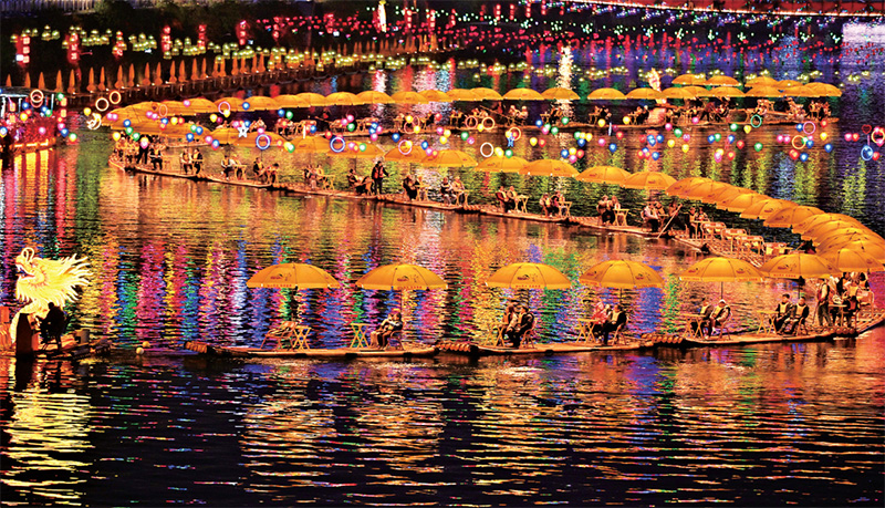 蛇年春節(jié),全國(guó)各地張燈結(jié)彩,人們參加各種喜慶活動(dòng),紅紅火火迎新春。圖為2025年1月21日晚,游客在湖北省宣恩縣貢水河中乘坐竹筏賞夜景。 新華社發(fā) 宋文/攝